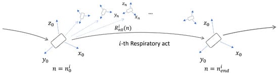 At this point, it is possible to use the orientation angles to transform the acceleration components from the local reference system to the global reference system. Assumptions regarding smartphone orientation during the respiratory act were made. The assumptions are summarized in Figure 6. In particular, it was hypothesized that the smartphone orientation was the same at the beginning and at the end of each respiratory act, defined by the initial local reference system . On the basis of this, a linear correction analogous to the one expressed in Equation (3) was imposed on as well. At a given time point n within the i-th respiratory act, the smartphone orientation was defined according to the generic local reference system . A time-varying rotation matrix can be defined to convert the components from the local reference system at time n to the local reference system at time .