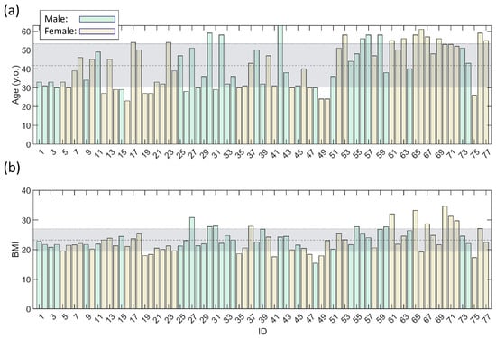 After validating the acquisition protocol, developing the dedicated application, and defining the signal processing, a specific acquisition campaign was carried out. The campaign was defined to gather data from a population of healthy volunteers. A total of 77 subjects with no known respiratory or cardiovascular pathologies were recruited. The subject distribution in terms of age and Body Mass Index (BMI), with corresponding mean ± standard deviation (42 ± 11.5 years old and BMI of 23.2 ± 3.8) and sex, are reported in Figure 7.