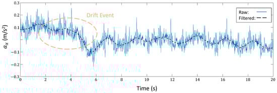 The artifact detection protocol imposed in this phase revealed the presence of drifting artifacts in the acquisitions of positions with vertical orientation (Figure 2a). An example of these events, occurring at position , is shown in Figure 8 before and after filtering. From the preliminary validation campaign, drifting artifacts appeared on 26% of the acquisitions with a vertical orientation. For this reason, only positions with a horizontal orientation were carried out in the successive acquisition campaign.