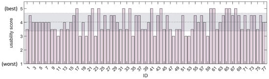 Concerning the acquisition campaign, 77 healthy volunteers were recruited. The scores in terms of the application’s usability were satisfactory (Figure 9), with a mean score of 4.0 ± 0.6 on a scale from 1 to 5.