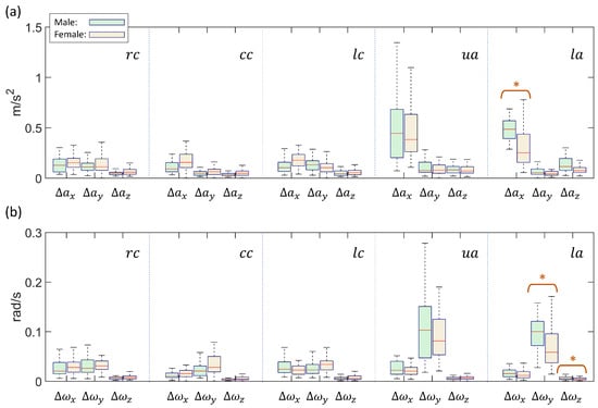 Box plots for male and female populations in terms of acceleration ranges (a) and angular speed ranges (b), grouped according to different smartphone positions. Significant differences () are reported with an asterisk.