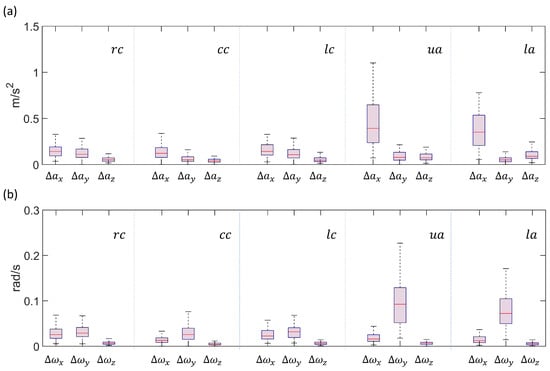 Box plots for the overall population in terms of acceleration ranges (a) and angular speed ranges (b), grouped according to different smartphone positions.