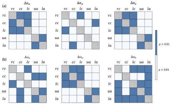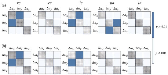 The results of Kolmogorov–Smirnov tests were reported in terms of over–under threshold p-values. In particular, Figure 12 schematizes the p-values to assess the statistical significance of differences between the main components of acceleration (Figure 12a) and gyroscope (Figure 12b) vector component ranges. Similarly, the results of statistical significance of the different smartphone positions are summarized in Figure 13 in terms of acceleration (Figure 13a) and gyroscope (Figure 13b) vector component ranges. For all the schemes of Figure 12 and Figure 13, light squares are used to highlight statistically significant differences ().
