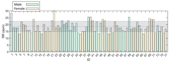 Finally, the RR was calculated for all the subjects from the signal acquired during the campaign (Figure 14). The reported mean ± standard deviation values are 18.6 ± 3.8 apm, which fall within in the physiological range according to the literature [].