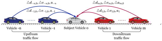 Consider an open, flat, single-lane scenario. In this setup, the SV is indexed as 0. The preceding vehicles in the downstream traffic flow are represented by the set , and the vehicles trailing the SV in the upstream traffic flow are indexed using the set . In a connected environment, the SV is able to gather the motion statuses of the surrounding vehicles, which always include relative distance , relative velocity , and acceleration of each vehicle . The SV then makes informed decisions based on this information.