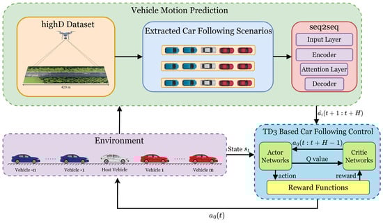 Figure 2 shows the framework for a CF control strategy, which is based on RL and the prediction of the surrounding vehicles’ motion statuses. Utilizing a seq2seq network, the acceleration kinematic states of surrounding vehicles, represented as , , are predicted, thereby enabling a proactive adaptation to the dynamic traffic environment at each time step, with CF scenarios extracted from the highD dataset. In this refined RL framework, the prediction of surrounding vehicles’ motion statuses employs a sophisticated network that utilizes both real-time and historical data facilitated by V2V communication technology. The subsequent control strategy rooted in this framework operates within an interactive RL environment, wherein the agent, guided by the actor-critic network and the TD3 policy algorithm, seeks to optimize its decisions to enhance the reward outcomes, hence updating the environment to the succeeding state effectively.
