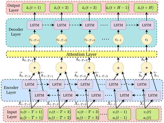 To comprehensively account for the diverse influences on driving behavior and develop an intelligent model for predicting future vehicle motion statuses, a refined seq2seq deep learning architecture is proposed. This model focuses on harnessing historical vehicle data to predict future motion statuses within a certain time horizon, aiming to proactively adapt to dynamic traffic conditions. Specifically, the model integrates a seq2seq network with bidirectional long short-term memory (Bi-LSTM) units as the encoder and unidirectional LSTM as the decoder. This adaptation utilizes the robustness and sequential modeling capabilities inherent in LSTM networks. By employing this framework, intricate motion patterns from historical vehicle motion statuses can be effectively extracted and understood, facilitating accurate predictions of future motion statuses. Furthermore, an attention mechanism is introduced to enhance the model’s capacity to capture and prioritize critical temporal features, thereby generating context vectors at each time interval. The model is presented in Figure 3.