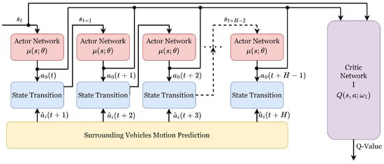 To account for future dynamics in the traffic environment, the traditional actor-critic network is augmented as depicted in Figure 5. The actor network provides the acceleration sequence spanning the predictive horizon at the current time step, represented by . The architectures of actor and critic networks consist of an input layer, four fully connected hidden layers, and an output layer. The hidden layers encapsulate neuron counts of 128, 64, 32, and 16 in descending order. The activation functions of these hidden layers are the rectified linear unit (ReLU), whereas the hyperbolic tangent function (tanh) is adopted by the output layer for its activation procedure.