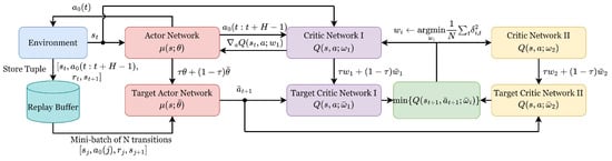 As an evolved variant of DDPG, a TD3 algorithm integrates essential modifications to enhance performance [21]. In order to overcome the overestimation problem of DDPG, the strategy termed clipped double Q-learning is proposed, which incorporates twin value networks , and one policy network . Each network aligns with a respective target counterpart, namely, , and . The second key enhancement in TD3 is the addition of noise , drawn from a clipped normal distribution, to further improve the algorithm’s robustness: