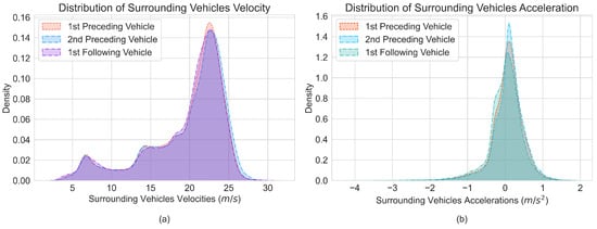 Trajectories of surrounding HDVs were extracted from the highD dataset and kept fixed for the SV during the training process of the RL-based CF strategy. This allows the agent to gain a deeper insight into human driving behavior and identify potential policy enhancements. There are 1612 four-vehicle mode scenarios extracted from the dataset based on the following criteria. The probability distribution histograms of the motion statuses of surrounding vehicles are shown in Figure 7, and kernel density estimation has been employed to approximate the probability density function: