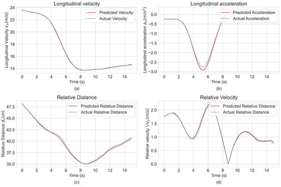 The seq2seq prediction performance on the scenario with SV no. 2336 and preceding vehicle no. 2331 of track 26 in the test dataset. (a) Longitudinal velocity. (b) Longitudinal acceleration. (c) Relative distance. (d) Relative velocity.