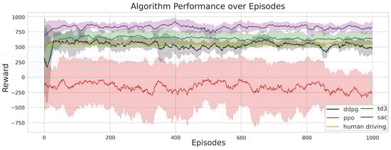 Given the variable length of CF episodes and the actor network’s random exploration, a moving average of episode rewards with a window size of 50 is utilized to discern reward trends and evaluate the algorithm’s performance. This entire process undergoes 10 rounds to evaluate the algorithm’s convergence. To verify the performance of the proposed method, some mainstream RL algorithms, such as DDPG, SAC, and PPO, are implemented for comparison. Figure 9 depicts the evolution of the moving average episode reward during the training episodes. Solid colored lines indicate the mean over multiple rounds, while shaded regions denote the standard deviation around these mean values. The TD3 agent’s moving average episode reward outperforms those of other agents, including those involving human driving actions. The TD3 algorithm’s reward converges around 820, whereas the SAC reward stabilizes around 635. Both the PPO and DDPG algorithms consistently underperform compared with human driving.