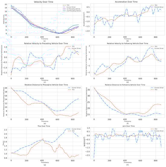 TD3’s dual Q-learning mechanism aims to mitigate overestimations of Q-values, while its delayed policy updates ensure infrequent policy modifications. Furthermore, TD3 introduces a policy noise clipping technique, preventing excessive variations during policy updates. In continuous action scenarios like CF, vehicles are expected to respond smoothly and consistently across varying driving scenarios. Any abrupt or substantial policy shifts can lead to suboptimal driving behavior. In comparison, DDPG may suffer from overestimation of Q-values, leading to unstable training. While PPO exhibits commendable performance in discrete action space tasks, it may not be as adept as TD3 or SAC in continuous control tasks. On the other hand, while SAC enhances its policy’s exploratory nature using the maximum entropy principle and is generally effective, its stochastic approach can sometimes lead to undue exploration. This might cause SAC to underperform relative to TD3 in certain driving scenarios. Subsequent analysis will thus center on comparing the TD3 agent’s performance with human driving behavior.