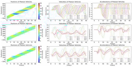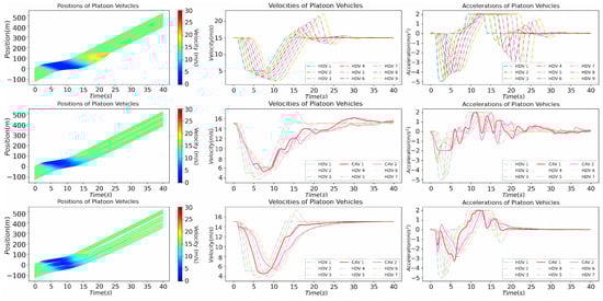 Braking perturbation platoon analysis. The first row in the figure represents the all-HDV scenario, while the second and third rows represent the MPC-controlled CAVs and TD3-controlled CAVs, respectively.