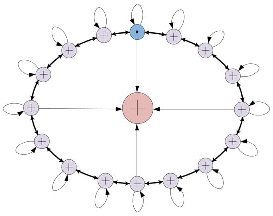 A TRNG of a Rosin Autonomous Boolean Network with n nodes [] is shown in Figure 1. The nodes in this network have only one exclusive NXOR gate (denoted as ⊙), and the others are exclusive XOR gates (denoted as ⊕, around the circumference of the circle). Each node has three inputs, one output, and self-feedback. Adjacent nodes are inputs to each other and arrow represents wire. The true random number is obtained by sampling the XOR values (the red ⊕) of four network nodes through low-frequency clock signals. Whether this network generates chaotic oscillation depends on the initial conditions and the setting of delay, that is, ideally, there is no stagnation point.
