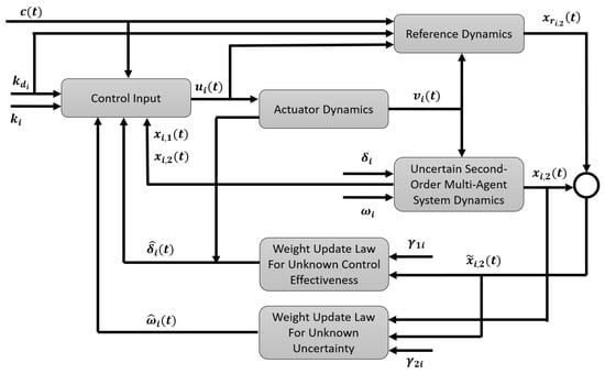 where γ 1 i R + and γ 2 i R + are the learning rates for the estimation algorithms and x ˜ i , 2 ( t ) = x i , 2 ( t ) x r i , 2 ( t ) R is the tracking error for the second state (i.e., velocity) of agent i. In (7), the first and second state terms are used following the literature on double-integrator multi-agent systems [14]. The adaptive parts of the controller are designed to make the multi-agent system dynamics given by (1) and (2) track the hedging-based reference model dynamics given by (3) and (4) asymptotically, while dealing with agent-based uncertainties and unknown control effectiveness. Please see Figure 1 for the structure of the proposed closed-loop system.
