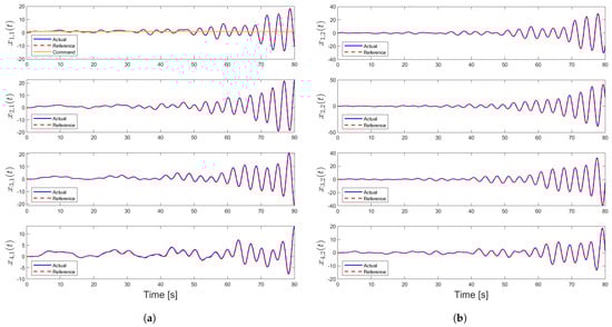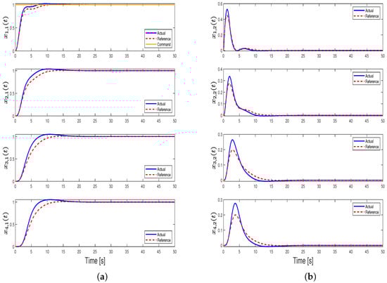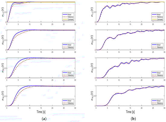 For the simulation of [31], the reference model matrices are selected to be A r = [ 0 , 1 ; 0.5 , 1 ] and B r = [ 0 , 0.5 ] T , which results in the same K 1 and K 2 values as selected in Case 4. The adaptive learning rates for update laws are selected to be the same as for the results of this paper, which are γ 1 i = γ 2 i = 10 . Also, the damping gain for all agents chosen as k d 1 , 2 , 3 , 4 = 0.5 , which are, again, the same damping gains selected for the results of this paper. The initial conditions on the system/actuator states and uncertainty estimations are set to zero. Figure 18, Figure 19 and Figure 20 show the resulting simulation comparison.