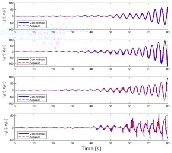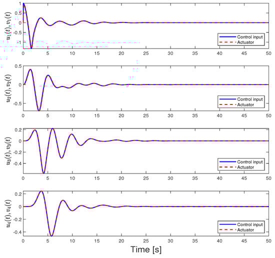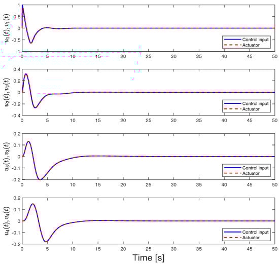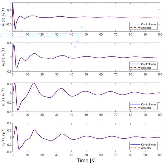 Figure 15. Distributed adaptive control inputs u i ( t ) and actuator outputs v i ( t ) for Case 4.