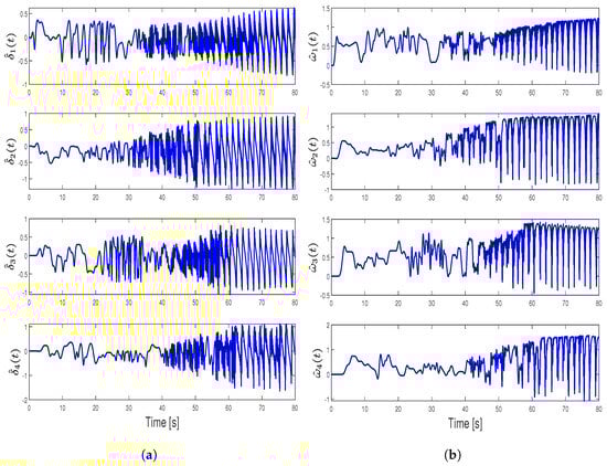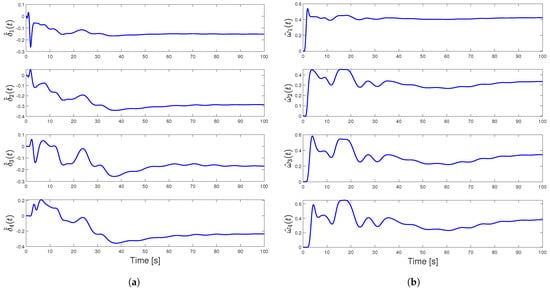 Figure 16. Adaptive estimates δ ^ i ( t ) and ω ^ i ( t ) for Case 4: (a) adaptive control effectiveness estimates δ ^ i ( t ) and (b) adaptive uncertainty estimates ω ^ i ( t ) .