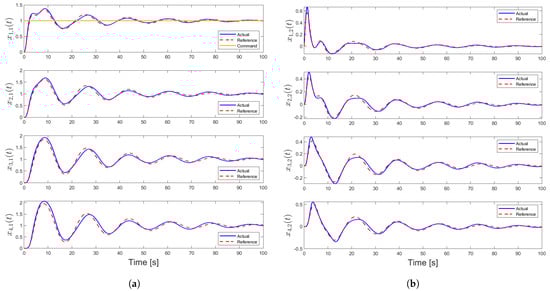 Using higher than second-order systems is possible and increases the size of the compact tracking error vector x ˜ ( t ) and the compact reference model matrix A r . However, as long as A r is Hurwitz, which requires an appropriate selection of compact control gain K 1 , regardless of the order of the system, it yields the same stability result. This condition enables obtaining the same stability result for systems with higher than second-order dynamics that can include acceleration and jerk when full-state feedback is available. Furthermore, changing the scalar actuator dynamics to high-order actuator dynamics is also possible. This change, along with increasing the dimension of the system, will affect the control input given by (7), update laws given by (8) and (9), and the hedging-based reference model dynamics given by (5) and (6). This will consequently require modifying the stability condition; thus, the Linear Matrix Inequalities analysis of the A Δ ^ ( t ) , W ^ ( t ) , M matrix is given by (21) in Assumption 1. However, as long as the stability condition holds, that is, the quadratic stability of the A Δ ^ ( t ) , W ^ ( t ) , M is satisfied, the asymptotic stability result will still hold owing to the hedging-based reference model structure.