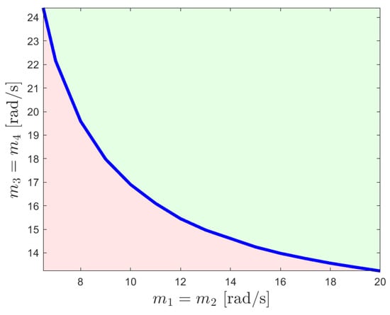 Figure 9. Actuator bandwidth set that makes A Δ ^ ( t ) , W ^ ( t ) , M quadratically stable after LMI analysis for Case 2. The blue curve represents the bandwidth limits, where the area highlighted with green refers to the feasible set of actuator bandwidths that provide quadratic stability and red refers to the unfeasible set.