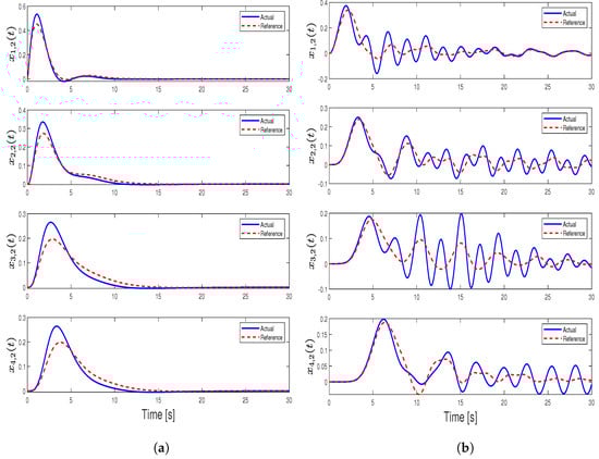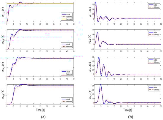 where x r ( t ) = x r 1 , 1 ( t ) , , x r n , 1 ( t ) , x r 1 , 2 ( t ) , , x r n , 2 ( t )   T R 2 n is the combined reference model state vector that consists of states of all agents, K d = diag ( k d 1 , , k d n ) D n × n is the diagonal matrix for the combined damping gains, A r R 2 n × 2 n is the reference model state matrix that is Hurwitz, and B r R 2 n × n is the reference model input matrix. Since A r is Hurwitz, 0 = A r   T P + P A r   T + I is satisfied with a positive definite matrix P R + 2 n × 2 n .