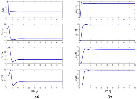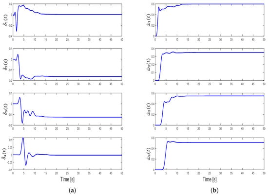 Figure 5. Adaptive estimates δ ^ i ( t ) and ω ^ i ( t ) for Case 1: (a) adaptive control effectiveness estimates δ ^ i ( t ) and (b) adaptive uncertainty estimates ω ^ i ( t ) .