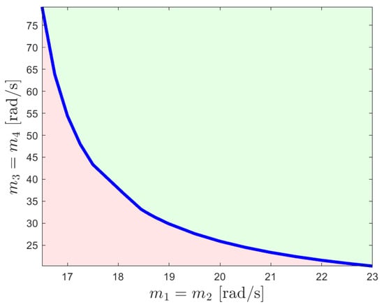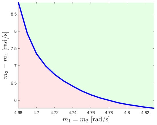 Figure 17. Actuator bandwidth set that makes A Δ ^ ( t ) , W ^ ( t ) , M quadratically stable after LMI analysis for Case 4. The blue curve represents the bandwidth limits, where the area highlighted with green refers to the feasible set of actuator bandwidths that provide quadratic stability, and red refers to the unfeasible set.
