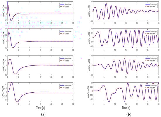 Figure 20. Distributed adaptive control inputs u i ( t ) and actuator outputs v i ( t ) comparison for Case 5: (a) distributed adaptive control inputs u i ( t ) and actuator outputs v i ( t ) and (b) distributed adaptive control inputs u i ( t ) and actuator outputs v i ( t ) in [31].