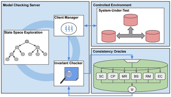 The proposed solution can solve the aforementioned problems by satisfying the requirements above by combining each subsystem that can solve each issue in a novel way. First, adding a hook carefully into the system-under-test allows it to tightly control non-deterministic behaviors as much as possible. Second, utilizing the stateless state space search technique allows it to support systematic and exhaustive state enumeration. Third, leveraging consistency oracles allows it to flexibly check for various consistency models. Fourth, using internally used ordering information exposed via a client API helps in inferring the order of operations to be used along with the consistency oracles to perform consistency invariant checking without needing to explore all interleaving of concurrent operations.