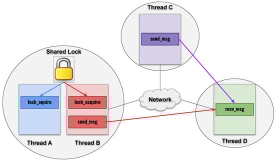 Figure 2 shows an example that illustrates the scenario where 4 threads concurrently run in parallel and, therefore, a few non-deterministic events occur. Each thread may be running on distributed nodes and communicating through the network. There may be a lock shared by threads running on the same node. For instance, Thread A and Thread B compete for the lock by trying to successfully execute lock_acquire first. In addition, more than two nodes may attempt to send messages to the common destination node at the same time. As an example, both Thread B and Thread C are concurrently executing send_msg. The order of each event is non-deterministic during the execution of the deployed system. Thread A may successfully invoke lock_acquire and obtain the exclusive ownership of the shared lock before Thread B does. However, it is also possible that Thread B successfully acquires the shared lock before Thread A does. Moreover, Thread B may send a message to Thread D before Thread C does, or the execution may occur in the reverse order.