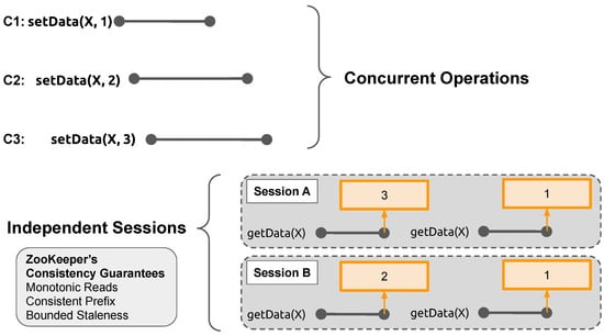 History from the client perspective without knowing the actual order of concurrent operations. Clients C1, C2, and C3 issued setData requests, which yield concurrent operations to apply in an arbitrary order via the ZAB protocol. Once those operations are applied, two independent sessions are started, and clients in each session issue a couple of getData requests sequentially. In Session A, the first and second getData invocations read the value of X that are 3 and 1, respectively. On the other hand, in Session B, the value 2 and 1 are read for the first and second getData for the key X, respectively. ZooKeeper’s consistency guarantees are specified to involve monotonic reads, consistent prefix, and bounded staleness.