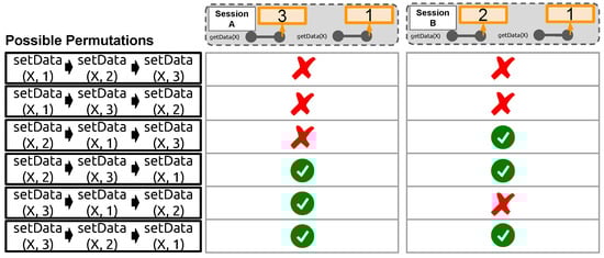 The fundamental problem of having difficulties in consistency invariant checking without knowing the exact ordering information about concurrent operations is that there can be too many possible interleaving scenarios. Figure 6 shows the illustration of applying such an approach to the same scenario depicted by Figure 5. With three concurrent writes, there are 6 possible permutation scenarios. Only when we find the permutation scenario that satisfies the given consistency guarantee can we conclude that there has been no consistency violation. For example, the fourth and sixth permutations in the Figure 6 make sense under the monotonic reads consistency model for both sessions. Thus, after either the fourth or the sixth permutation is checked, we can ensure that the given session histories have not involved any consistency violations. Although the illustrated example with 6 permutation scenarios seems manageable, it is not difficult to see that the number of possible permutation scenarios can exponentially grow as the number of concurrent requests increases. If there were 10 concurrent write operations, then there would have been 3,628,800 possible permutation scenarios! In addition, as failures may occur anytime, the number of permutations to check can quickly become overwhelming. The conventional consistency invariant checking approach may not complete within the reasonable duration due to the computational cost depending on the number of client requests and failure injection.