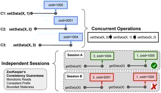History from the client perspective when knowing the order of concurrent operations allows us to correctly determine consistency guarantees. Logical timestamp values, which are zxid values, are shown in the figure for each ZooKeeper API request. Also, each session is marked with either valid or not valid using green check marks and red cross marks, respectively. Session A is permitted under the monotonic reads consistency model, while Session B is the violation of that consistency model.