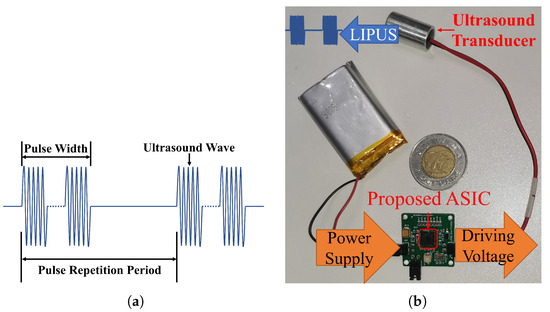 - Jiang, X.; Ng, W.T.; Chen, J. A miniaturized low-intensity ultrasound device for wearable medical therapeutic applications. IEEE Trans. Biomed. Circuits Syst. 2019, 13, 1372–1382. [Google Scholar] [CrossRef] [PubMed]