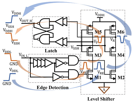 The HVLS is a critical component of the proposed system, as it enables the high-side NMOS of the HB driver to turn on. The primary purpose of the HVLS is to translate logic signals between different voltage domains, with propagation delay and power dissipation being critical parameters. Moreover, the size of the HVLS must be considered, as it affects the chip’s cost. Thus, the topology of the HVLS proposed in [25], which utilizes the pulse-triggering approach, was adopted in the proposed system. The overall circuit diagram of the HVLS is depicted in Figure 4, and it comprises an edge detection module, a level shifter, and a latch. The edge detection module generates a pulse to or at the rising or falling edge of the input signal , respectively. The level shifter then inverts and lifts the pulse from the low-voltage domain to the high-voltage domain. The resulting notching signal at or changes the latch’s state, thus toggling between the high () and low () levels. In the steady state, all the voltage levels remain stable, and the output is latched.