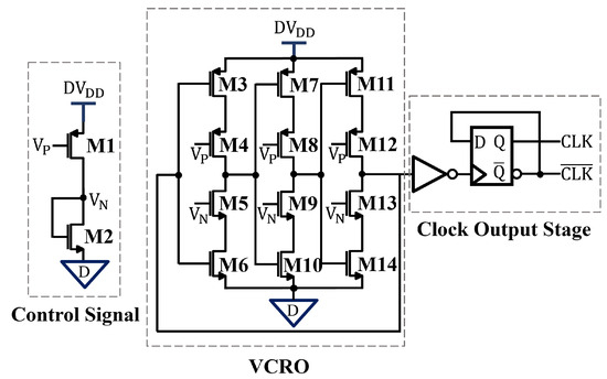Figure 6 shows the circuit diagram of the three-stage CSVCRO module, which comprises a complementary control signal generator, a CSVCRO core, and a clock output stage. The complementary control signal generator uses a half-current mirror topology to ensure similar currents through M1 and M2. M4, M8, and M12 limit the pull-up current flow, while M5, M9, and M13 limit the pull-down current flow. In this way, the complementary control signal makes the current limiting capacity of M4, M8, and M12 similar to that of M6, M10, and M14, which are directly controlled via the input control voltage . The three-stage CSVCRO core is composed of M3–M14, which forms three inverters. The current flows of these three inverters are limited by current sources and sinks controlled via and . The output clock signal is buffered via an inverter and then passed to a flip-flop to produce a clock signal with a precise 50% duty cycle and narrow rising and falling edges, making it closer to a square wave. An out-of-phase clock signal is generated simultaneously, which is also required for the charge pump module.