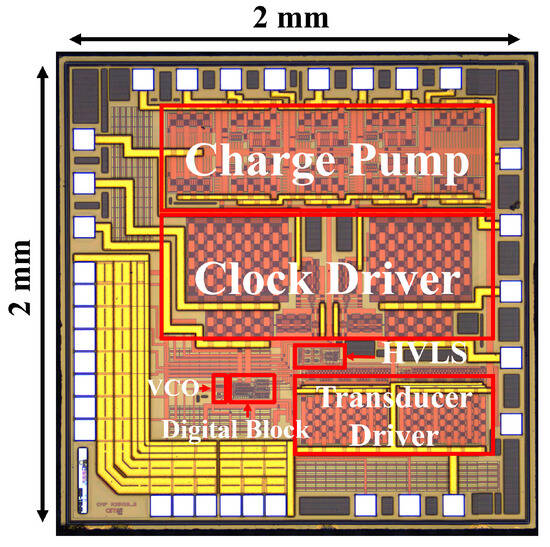 Prior to the tape-out, the proposed ASIC was simulated in the AMS 0.35 μm H35B4D3, HIT-kit v4.10, using a Cadence IC 6.1.5 Spectre Circuit Simulator (San Jose, CA, USA). Post-layout simulations were performed with the power supply set to 3.7 V by default. The micrograph of the bare die is shown in Figure 7, and its area is 4 mm2 including pads. The transistor parameters of the proposed design can be found in Table 1. The post-layout simulated performance of the entire chip, with a transducer load modeled using the Butterworth–Van Dyke model, is presented in Table 2. The capacitance of all capacitors in the array was 4.7 nF, which was chosen after the thorough consideration of several factors, including charge pump output power capacity, efficiency, ripple amplitude, startup speed, and dynamic performance.
