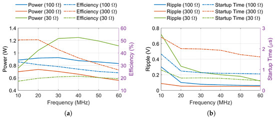 To assess the performance of the charge pump under diverse continuous-current delivery conditions, simulations were conducted with various resistive loads (30 Ω, 100 Ω, and 300 Ω) and frequencies (10–60 MHz). The simulation results for the output power, efficiency, ripple voltage, and startup time are presented in Figure 8a,b, where startup time is defined as the time required to reach 90% of the final output voltage. The results indicate that power conversion efficiency decreases with a heavier load. The optimal control frequency varies with the resistive load, necessitating a higher control frequency to achieve maximum output power under heavier loads. Moreover, the control frequency exhibits an influence on the power conversion efficiency, typically reaching its maximum near the frequency associated with peak power. Concurrently, the ripple voltage and the startup time demonstrate a decreasing trend as the control frequency increases. The charge pump typically completes startup in less than 3 μs, with a startup time of approximately 1 μs for 30 Ω and 100 Ω loads. Based on the simulation results, it was observed that a clock frequency range of 10–60 MHz fulfills the power output and speed requirements of the charge pump across common load scenarios. This implies that adjusting the VCO’s clock range to cover this frequency span would be beneficial, allowing flexibility to tailor the clock frequency based on specific application demands for output power, efficiency, ripple, and startup time.