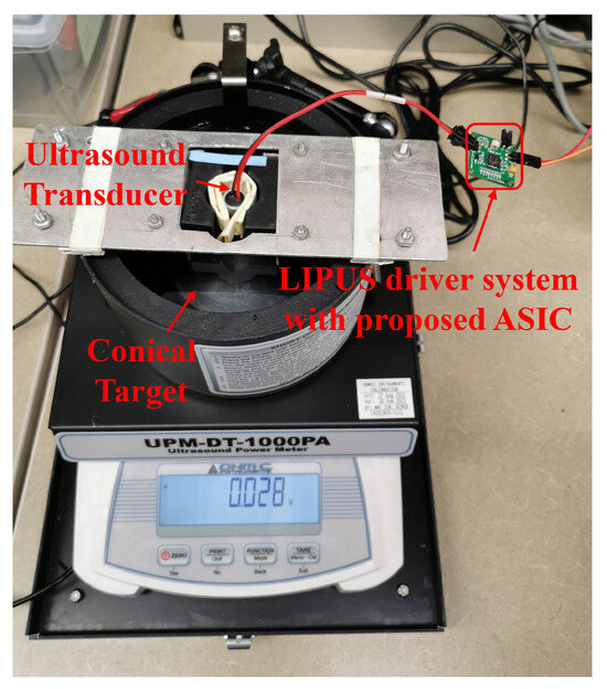 To evaluate the performance of the chip, we designed a corresponding peripheral circuit and performed testing. Since the primary objective of our design was to drive the ultrasound transducer, waveform, power input, power output, and ultrasonic power output measurements were used for evaluation. All capacitors in the array of the peripheral circuit were 4.7 nF X5R capacitors. The load used in the testing was a piezoelectric (PZT) transducer manufactured by APC International, Ltd. (Mackeyville, PA, USA), featuring a single resonance frequency of 1.5 MHz and a radiating surface area of 0.95 cm2. The impedance of the PZT transducer was measured using an MFIA Impedance Analyzer (Zurich Instruments, Zürich, Switzerland), and the results indicated an impedance of 96.2Ω∠−25.33° at 1.5 MHz. Output waveforms were recorded using a Tektronix TBS 2000 oscilloscope (Tektronix Inc., Beaverton, OR, USA), including the voltage on the load , the output voltage of the charge pump , and the current on the load . The system was powered using a Keithley 2231A-30-3 precision DC power supply (Keithley Instruments, Cleveland, OH, USA), which provided real-time power dissipation data in the front panel. The current on the load was measured by inserting a series resistor of 0.5 Ω on the ground side of the transducer and measuring the voltage across it. During testing, the controlling voltage was adjusted to the appropriate condition. The ultrasound power output of the transducer was measured utilizing an OHMIC UPM-DT-1000PA ultrasound power meter (OHMIC Instruments, St. Charles, MO, USA). The measurement setup is shown in Figure 9.