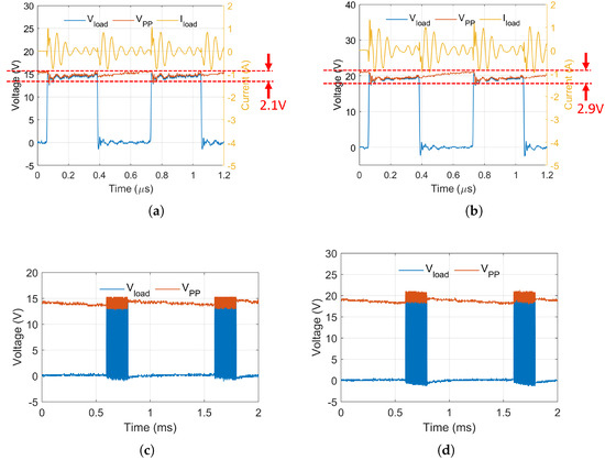 Figure 10a,b illustrate the waveforms measured with power supplies of 3.7 V and 5 V, respectively. It was observed that the output voltage of the charge pump () underwent an immediate drop at the rising edge of the load voltage (). This phenomenon was expected, and it was a result of a large transfer of charge from the energy storage capacitor of to the load when switch Q1 was turned on. At other times, the charge pump could restore to its previous level, as only a small number of charges would transfer to the load. The observed ripple in was largely caused by this immediate drop and subsequent restoration process, which is consistent with the simulation results. Furthermore, the implementation of a cross-coupled topology and a relatively high clock frequency in the range of tens of MHz enables the rapid replenishment of the load capacitor’s charge, ensuring the maintenance of a certain voltage level. The measured ripple was 2.1 V for a power supply of 3.7 V and 2.9 V for a power supply of 5 V. Furthermore, the impedance mismatch resulted in noticeable ringing in and , but the single resonant frequency characteristic of the ultrasound transducer made it insensitive to such distortions. Figure 10c,d presents the waveforms of and on a millisecond scale. These figures clearly show the pulsed working mode of the chip with a duty cycle of 20% and a pulse repetition frequency of 1 kHz. During the remaining 80% idle state, the charge pump was turned off to conserve energy. These figures also reveal that fell slowly due to the leakage current during the idle state.