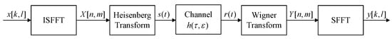 where denotes the symbols of the k-th Doppler axis and the l-th delay axis in the DD domain and M and N are the numbers of delay bins and Doppler bins, respectively. Subsequently, the TF domain symbols are transformed into the time domain by the Heisenberg transform, which can be expressed as