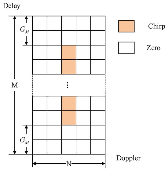 The UE randomly selects one of the available RAPs to initiate random access. Afterward, the RAP composed of a chirp signal is mapped onto the center of the DD plane as shown in Figure 2. Guard bands are set aside for the delay and to Doppler axes to prevent interference with adjacent OTFS frames, respectively. The RAP frame of the q-th UE in the DD domain is