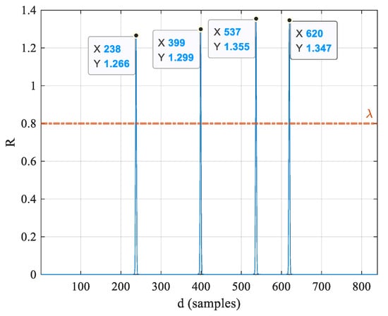 The access UEs and corresponding TAs can be estimated by the cyclic shift sample in case the amplitude of is larger than the detection threshold . As shown in Figure 4, the detection function exhibits four peaks as the number of simultaneous access UEs is four, and the abscissas of the peaks are the corresponding cyclic shifts . The cyclic shift sample d can be rewritten as , where k is used to detect the RAPs sent by UEs and l is used to estimate the TAs corresponding to these UEs. Therefore, the estimated and TA can be expressed as