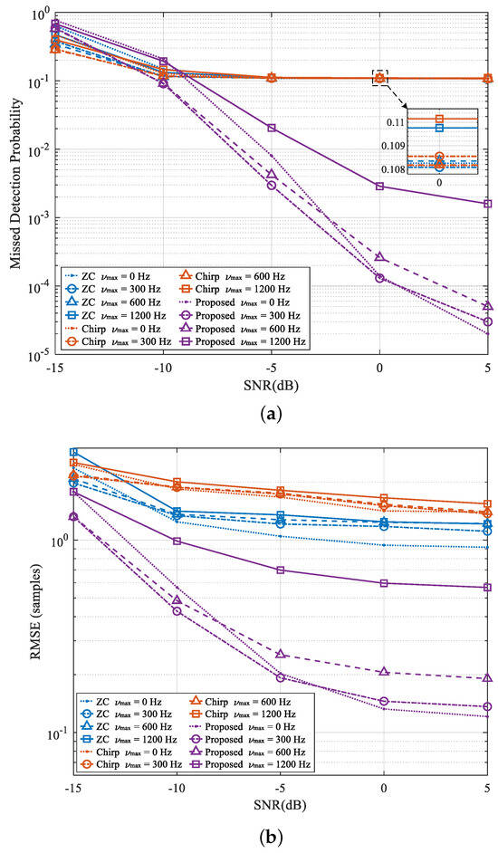 Figure 5 illustrates the MDP and RMSE performances under different Doppler shifts. The maximum Doppler shifts are set to 0 Hz, 300 Hz, 600 Hz, and 1200 Hz, corresponding to static, low-speed, medium-speed, and high-speed scenarios, respectively. The number of UEs attempting to access simultaneously is . Figure 5a shows the MDP versus SNR performance. The proposed algorithm performance substantially improves as the SNR increases, while the two comparison algorithms show almost the same performance and exhibit a floor effect when the SNR increases. In addition, with the increase in the Doppler shift, the MDP performance of the two comparison algorithms hardly decreases, while that of the proposed method gradually decreases as the Doppler shift increases, with the exception of when it is 0 Hz. When the SNR ≤−5 dB, the MDP performance of the proposed scheme under a Doppler shift of 0 Hz is worse than that under 300 Hz and 600 Hz. The reason is that the same is used for all Doppler shift conditions in the Doppler diversity scheme, which leads to more noise superimposed on the receiving sequence of RAP detection, thus decreasing the performance. It is clear that the proposed algorithm outperforms the comparison algorithms for the SNR >−10 dB and only shows a little gap when the SNR is lower. Figure 5b depicts the RMSE performance of TA estimation. It is evident that the RMSE performance of the proposed scheme exhibits the same trend as the MDP performance. In addition, the RMSE performance of the “ZC” approach is slightly better than that of the “Chirp” approach, and the performance of both approaches decreases with the increase in the Doppler shift and increases with the increase in the SNR. It is obvious that the proposed algorithm outperforms the two comparison approaches in terms of the RMSE. In summary, the proposed algorithm exhibits superior RAP detection and TA estimation performance in harsh environments with a low SNR and high Doppler shift.