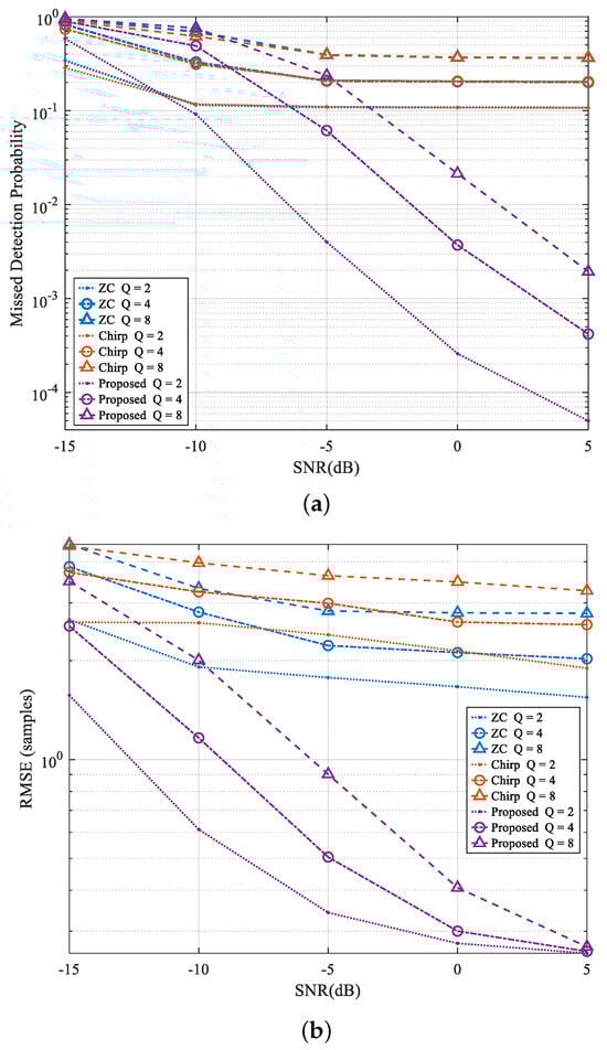 Figure 6 depicts the performance comparison of the algorithms when the number of UEs attempting to access simultaneously varied. The maximum Doppler shift is equal to 600 Hz and the number of UEs attempting to access simultaneously is . Figure 6a represents the MDP performance versus the SNR for different Qs. The MDP performance of the proposed method gradually improves as the SNR increases. The performance of the two comparison algorithms, however, exhibits a floor effect as the SNR increases. In addition, as the number of UEs increases, inter-user interference and the total noise of the received signal also increase, which deteriorates the detection performance, and thus the MDP performance of the three simulation algorithms degrades. The proposed algorithm outperforms the comparison algorithms for the SNR >−10 dB and only exhibits a small gap for the lower SNR. Figure 6b illustrates the RMSE performance of TA estimation for different Qs. The RMSE performance of the proposed approach increases as the SNR increases and decreases as Q increases. In addition, as the SNR increases, the RMSE performance gap for different Qs becomes smaller and approaches zero. Furthermore, the RMSE performance of the “ZC” approach is slightly better than that of the “Chirp” approach. Meanwhile, the performance of both comparison algorithms decreases with the increase in Q and increases with the increase in the SNR. It is obvious that the proposed algorithm outperforms the two comparison algorithms in terms of the RMSE. In general, the proposed scheme can attain a remarkable performance improvement under multiple access users.
