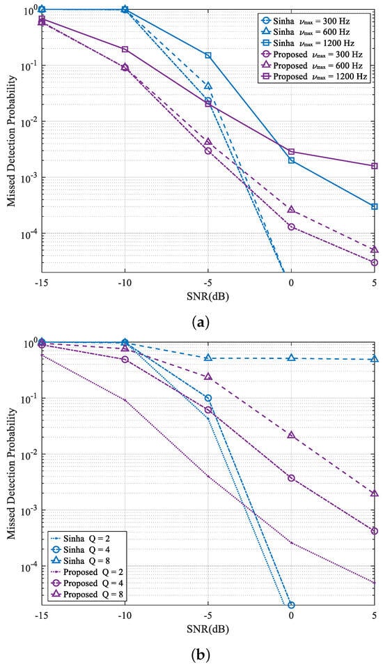 Comparison of RAP detection performance between the proposed scheme and the Sinha algorithm. (a) Different Doppler conditions. (b) Different Q conditions.
