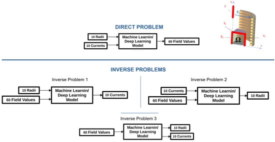 Alternatively, Machine Learning (ML) and Deep Learning (DL) models can be used for the straightforward resolution of inverse or optimal design problems. This can be done by training the NN to build an (approximated) relationship between the desired output (e.g., sensor readings) and the trial values of the degrees of freedom (e.g., radii or currents of coils, when considering magnets), starting from available examples of the desired output [3,4,5,6,7]. Examples can be obtained by solving a reduced set of instances for the computationally demanding problem, or even be extracted from experimental data.