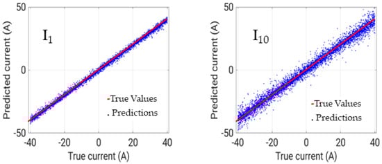 Regression plots of the predicted vs. true currents for the IP#1. The red curve is the exact fit (True Values), while the blue dots are the network prediction.