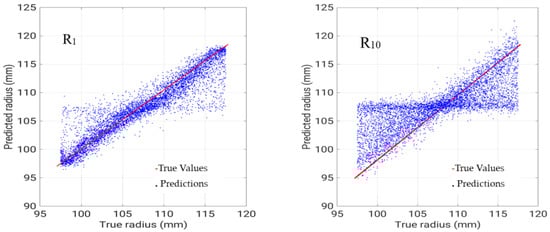Figure 8 evidences that the problem of predicting the radii is more difficult, as expected.